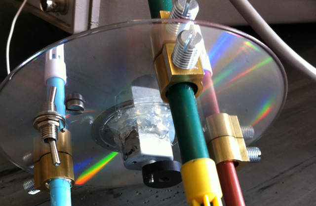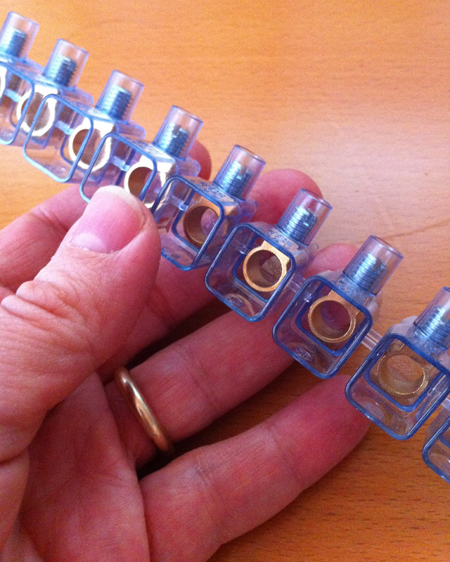 Procuratevi dei morsetti elettrici di grosse dimensioni ed estraete l’anima interna, questa verrà utilizzata per fissare i pennarelli sul cd-rom, inoltre le viti consentiranno di variare agevolmente l’altezza del baricentro e di conseguenza anche l’intensità di oscillazione dei pennarelli.