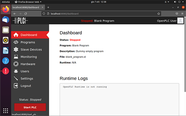 Avviate il PLC facendo clic su “Start PLC”. Se all’interno della dashboard di OpnePLC vengono visualizzati messaggi di timeout, non preoccupatevi è una situazione normale, tutte le schede Arduino hanno una funzione di ripristino automatico che riavvia la scheda ogni volta che viene effettuata una nuova connessione USB, quindi una volta che OpenPLC avvia una comunicazione, il primo tentativo di inviare un messaggio alla scheda fallisce perché la scheda Arduino si sta ancora avviando dopo un ripristino. Dopo pochi millisecondi la scheda è completamente operativa, dovreste vedete i LED Tx ed Rx lampeggiare, ciò identifica il funzionamento del sistema.