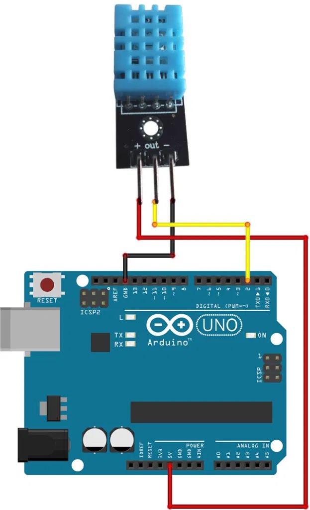 A titolo di esempio consideriamo il mio post in cui mostravo come utilizzare un DHT11 e visualizzeremo sulla Serial Plotter le due grandezze fisiche temperatura ed umidità. Di seguito schema di collegamento, sketch e grafici.