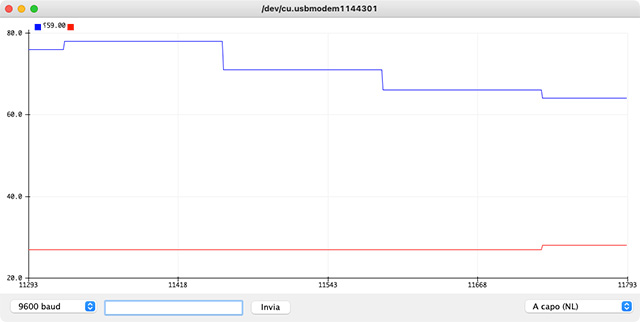 La Serial Plotter prende i valori che giungono dalla seriale (connessione USB) e li grafica su un piano cartesiano. I dati numerici vengono anche visualizzati nella parte in alto a sinistra della finestra della Serial Plotter.