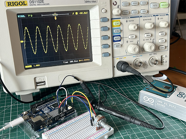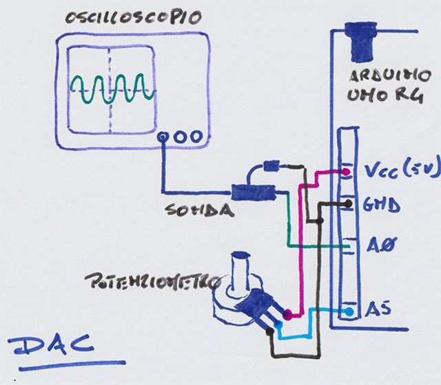 La sonda dell’oscilloscopio deve essere connessa al pin A0 che viene usata come uscita del DAC. Il potenziometro ha il pin centrale connesso ad A5 (ingresso del DAC), un pin laterale connesso a 5V sulla scheda e l’altro pin laterale connesso a GND sulla scheda.