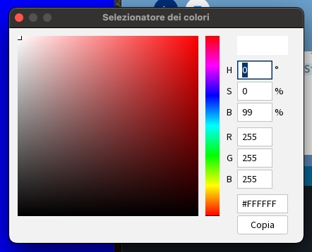 Una volta aperta la finestra del selettore, si può esplorare la gamma di colori disponibili e ottenere i relativi valori RGB(Rosso, Verde, Blu). Inoltre, lo strumento fornisce informazioni anche sui valori: