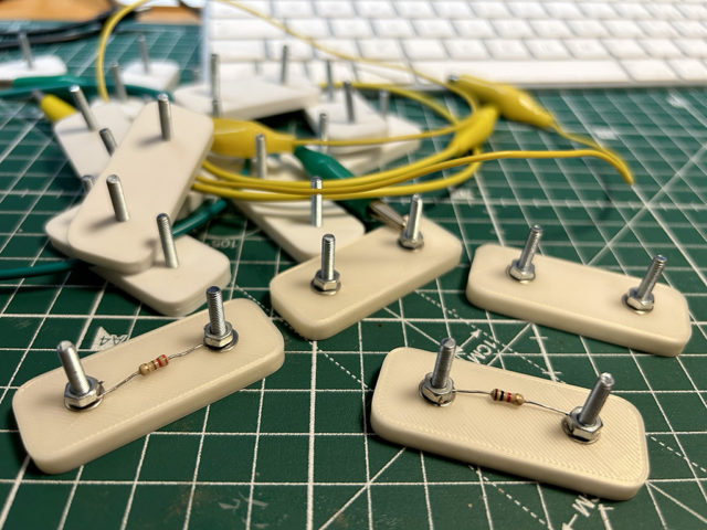 Tuttavia, recentemente, la mia attività di insegnamento è tornata a quei blocchetti iniziali un po’ per necessità pratica ed un po’ per la gestione di classi “particolari” da motivare. Mi è stato chiesto di ideare lezioni con un’attività di laboratorio della durata di non più di 45 minuti per classi di seconda superiore. Ho constatato che molti studenti non avevano mai avuto esperienza diretta con componenti elettronici o strumenti di misura. Da qui l’idea di reintrodurre l’approccio “manuale” e intuitivo delle mie origini. Ho pensato a blocchetti stampati in 3D in cui inserire i reofori dei resistori, fissati mediante viti e bulloni. Queste viti, estendendo i reofori, facilitano il collegamento con altri resistori mediante connettori a coccodrillo.