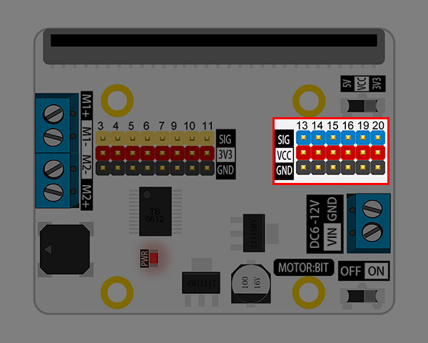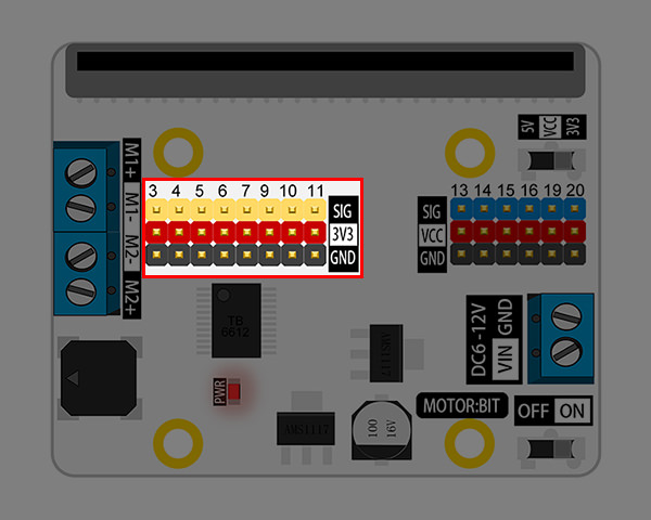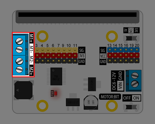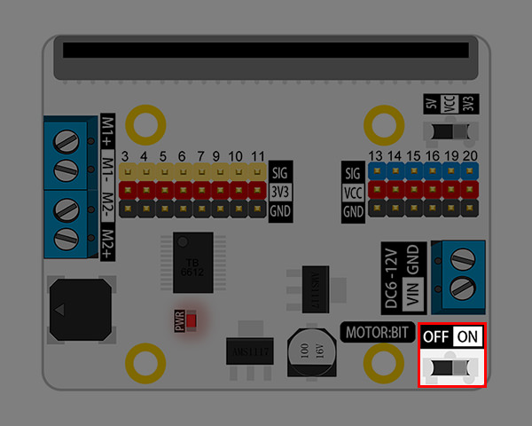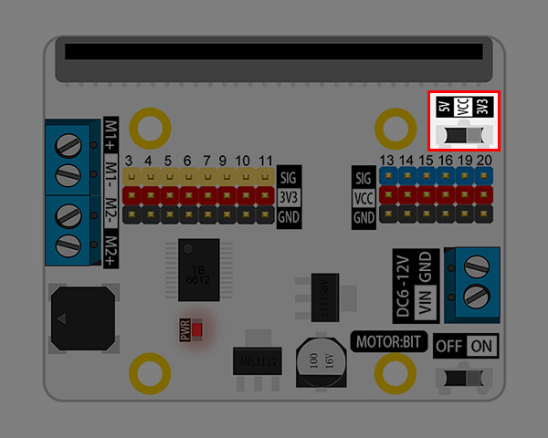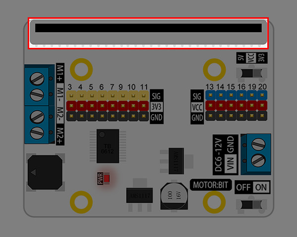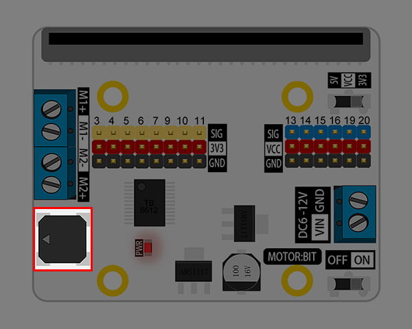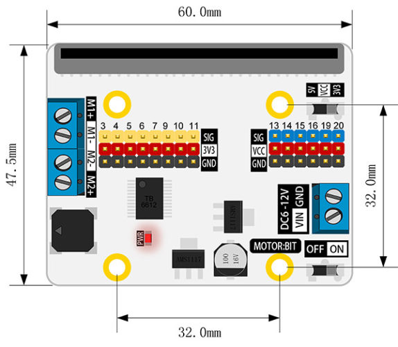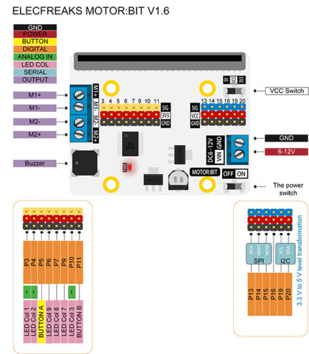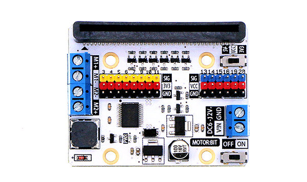 Motor:bit è una scheda di controllo motori utilizzabile con micro:bit. L’integrato il driver utilizzato è il TB6612, in grado di pilotare due motori con una corrente massima erogata per ciascun canale di 1.2A. Sulla scheda sono disposti 16 pin maschi I/O e su ciascuno di essi è presente il pin GND e Vcc, i pin 19 e 20 dedicati alla comunicazione I2C, i pinn 13, 14, 15 per la comunicazione SPI. Sulla scheda i pin I/O da P3 a P7 e da P9 a P10 permettono di pilotare direttamente dispositivi a 3.3V; mentre i pin da P13 a P16 e da P19 a P20 è possibile selezionare la tensione tensione 3.3V/5V mediante uno switch specifico. Sulla scheda è inoltre presente un buzzer passivo.
