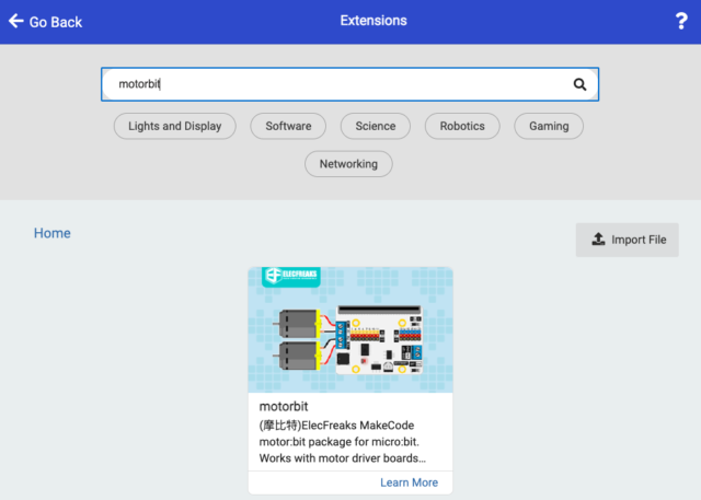 Dal MakeCode Editor aggiungere l’estensione motorbit: