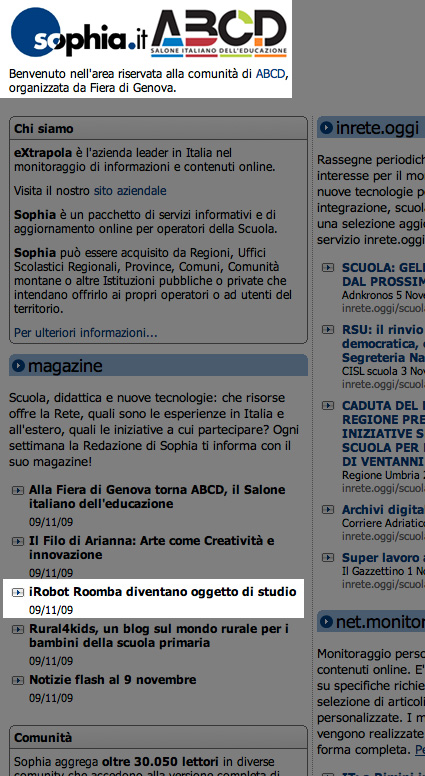 Il noto network Sophia.it è che si occupa di servizi informativi e di aggiornamento online per operatori della Scuola pubblica il comunicato stampa del progetto a cui sto partecipando: “Roomba a scuola”: