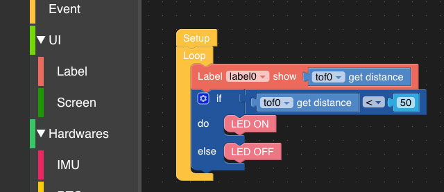 Nel programma indicato di seguito viene misurate la distanza dell’ostacolo è nel caso in cui la misura sia inferiore ai 50 mm viene acceso il LED rosso disposto sull’M5Stick mini.