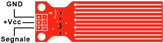 Il segnale di uscita del sensore (pin S) verrà inviato su un pin analogico di Arduino e da esso convertito in un valore numerico che oscillerà tra ~ 0 e ~500, pertanto se il sensore non è immerso il valore misurato sarà di circa 0, mentre se sarà totalmente immerso raggiungerà il valore massimo rilevato.