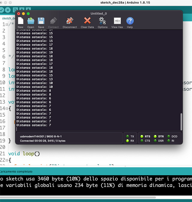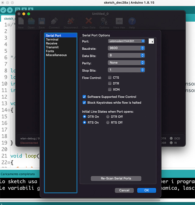 - se notate qualche formattazione del codice di esempio (codice tutto su un riga) ciò è imputabile a qualche carattere precedente nello sketch che aggiunge un errore di formattazione, poiché ancora non ho trovato soluzione, fate “copia ed incolla” nell’IDE Arduino ed una successiva “Formattazione automatica” dal menù strumenti questo aggiusta tutto
