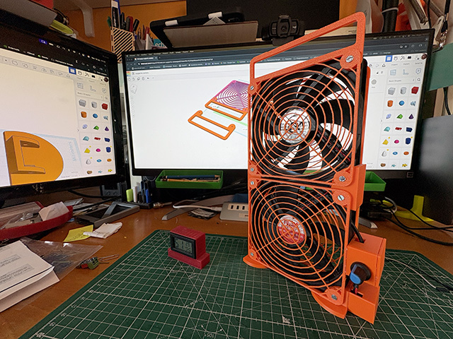 Le ventole sono da 120 mm. Cerco su Thingiverse delle griglie di protezione; poi, armato di calibro, progetto i piedini di supporto, i blocchetti per unire le due ventole, un manico per trasportare il mio EcoFan e, dopo circa un’ora, le stampe sono pronte.